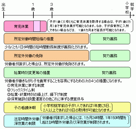 3歳までの子を養育する労働者について、原則として、1日の所定労働時間を6時間にするなど所定労働時間の短縮の措置を講じること、請求があった場合には、所定外労働を免除しなければならないことになりました。